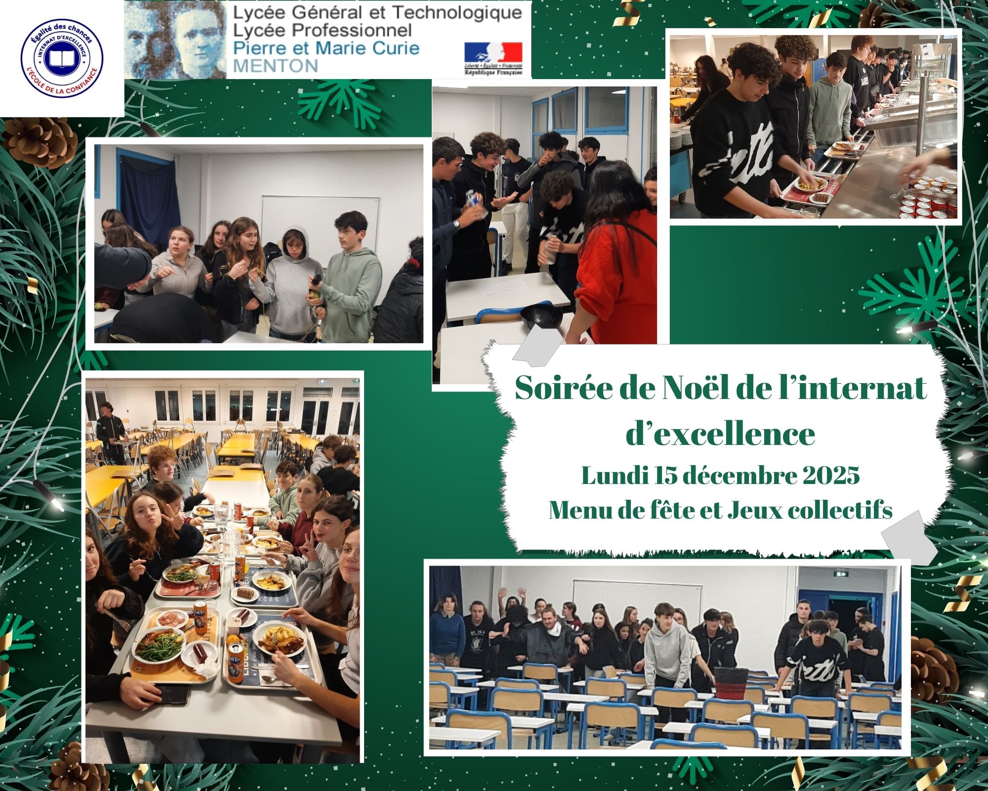 « Lundi 15 décembre 2025, tous les internes se sont retrouvés pour partager un moment convivial à l’occasion de la Soirée de Noël, au programme un menu de fête préparé par l’équipe de la cuisine et des jeux collectifs organisés par les Maitres d’internat. »